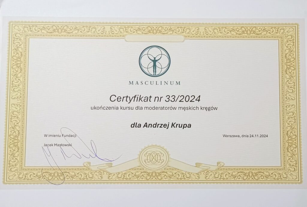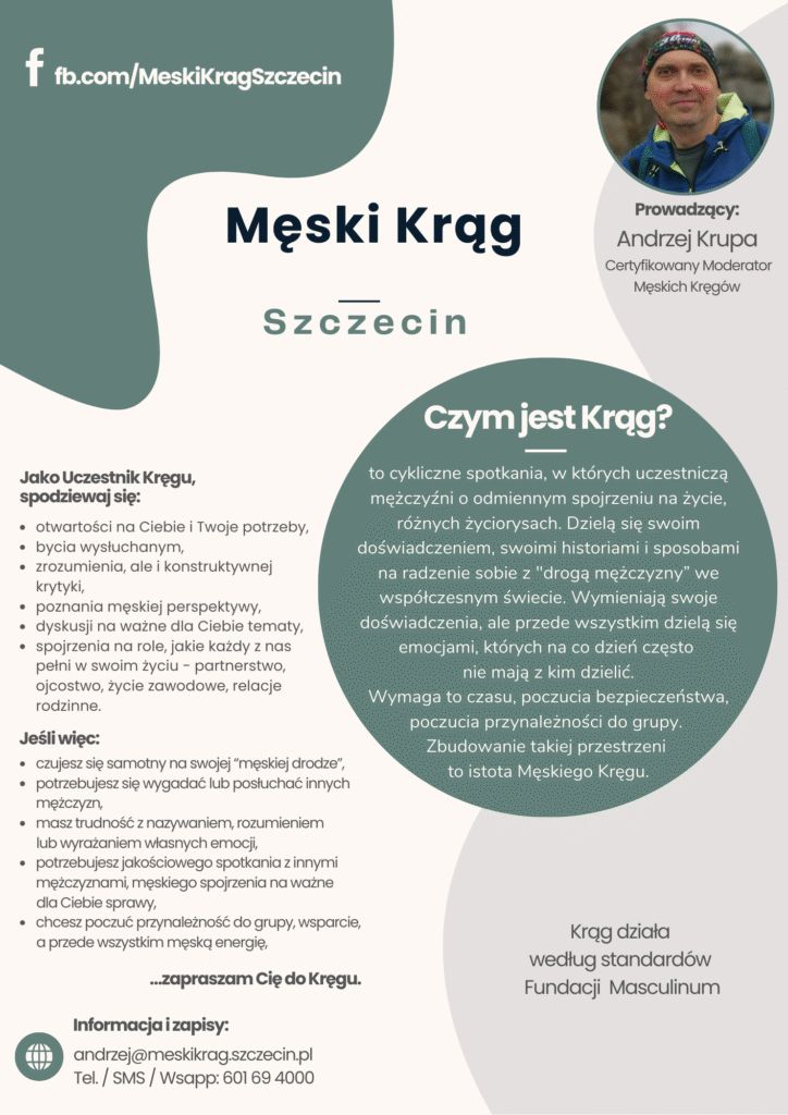 Nazywam się Andrzej Krupa i od początku uczestniczę w męskich kręgach według standardów Fundacji, gdzie zaspokajam potrzebę szczerej rozmowy, wsparcia i dzielenia się emocjami. Polecam je każdemu mężczyźnie, który chce otworzyć się na męską siłę, wrażliwość i lepiej zrozumieć swoje potrzeby. Wychowani głównie przez kobiety, często brakuje nam zdrowych męskich relacji, a dojrzały mężczyzna to oparcie dla bliskich.